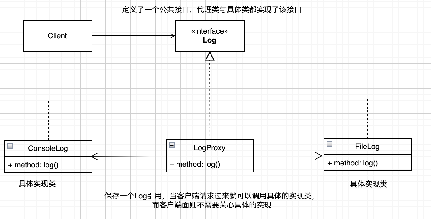 | public class StaticProxyExample { public static void main(String[] args) { Log consoleLog = new ConsoleLog(); LogProxy logProxy = new LogProxy(consoleLog); logProxy.info("console log by proxy");