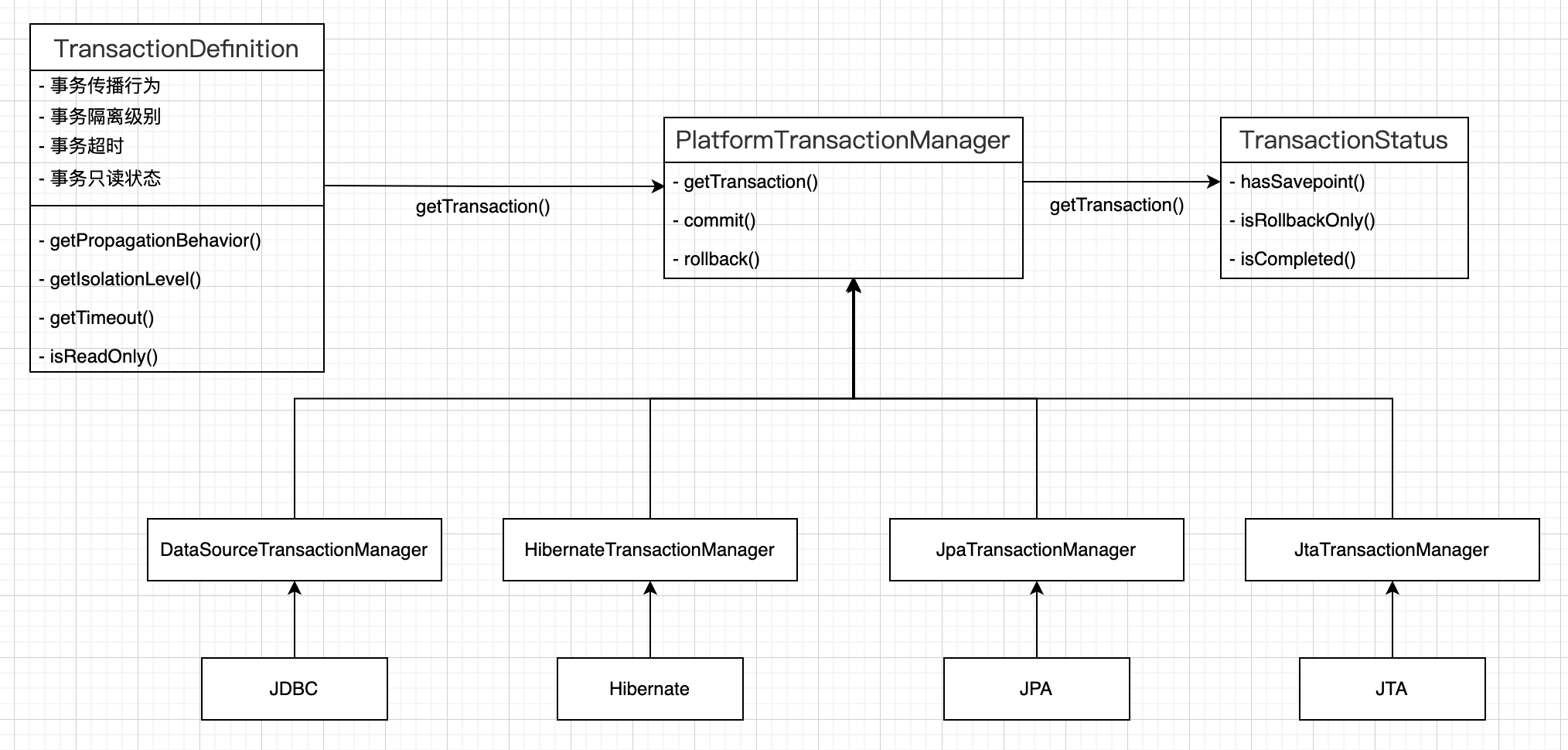 1 2 3 4 5 6 7 8 public interface PlatformTransactionManager extends TransactionManager { TransactionStatus getTransaction (@Nullable TransactionDefinition definition) throws TransactionException; void commit (TransactionStatus status) throws TransactionException; void rollback (TransactionStatus status) throws TransactionException; }