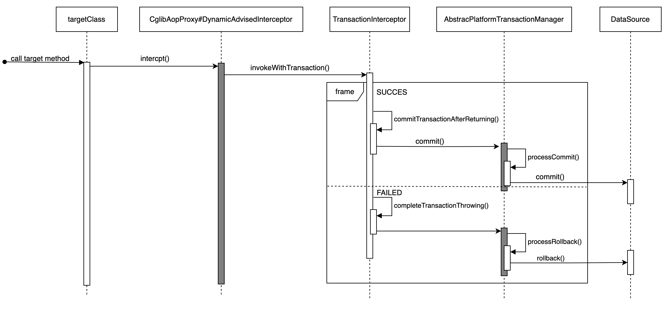1 2 3 4 5 6 7 8 9 10 11 12 13 14 15 16 17 18 19 20 21 22 23 24 25 26 27 28 29 30 31 32 33 34 35 36 37 38 39 40 41 42 43 44 45 46 47 48 49 50 51 52 53 54 55 56 57 58 59 60 61 62 63 64 65 66 67 68 69 70 71 72 73 74 75 76 77 78 79 80 81 82 @Nullable protected Object invokeWithinTransaction (Method method, @Nullable Class<?> targetClass, final InvocationCallback invocation) throws Throwable { TransactionAttributeSource tas = getTransactionAttributeSource(); final TransactionAttribute txAttr = (tas != null ? tas.getTransactionAttribute(method, targetClass) : null ); final TransactionManager tm = determineTransactionManager(txAttr); if (this .reactiveAdapterRegistry != null && tm instanceof ReactiveTransactionManager rtm) { } PlatformTransactionManager ptm = asPlatformTransactionManager(tm); final String joinpointIdentification = methodIdentification(method, targetClass, txAttr); if (txAttr == null || !(ptm instanceof CallbackPreferringPlatformTransactionManager cpptm)) { TransactionInfo txInfo = createTransactionIfNecessary(ptm, txAttr, joinpointIdentification); Object retVal; try { retVal = invocation.proceedWithInvocation(); } catch (Throwable ex) { completeTransactionAfterThrowing(txInfo, ex); throw ex; } finally { cleanupTransactionInfo(txInfo); } if (retVal != null && txAttr != null ) { TransactionStatus status = txInfo.getTransactionStatus(); if (status != null ) { if (retVal instanceof Future<?> future && future.isDone()) { try { future.get(); } } .... } } commitTransactionAfterReturning(txInfo); return retVal; } else { Object result; ...... return result; } }protected TransactionInfo createTransactionIfNecessary (@Nullable PlatformTransactionManager tm, @Nullable TransactionAttribute txAttr, final String joinpointIdentification) { if (txAttr != null && txAttr.getName() == null ) { txAttr = new DelegatingTransactionAttribute (txAttr) { @Override public String getName () { return joinpointIdentification; } }; } TransactionStatus status = null ; if (txAttr != null ) { if (tm != null ) { status = tm.getTransaction(txAttr); } } return prepareTransactionInfo(tm, txAttr, joinpointIdentification, status); }