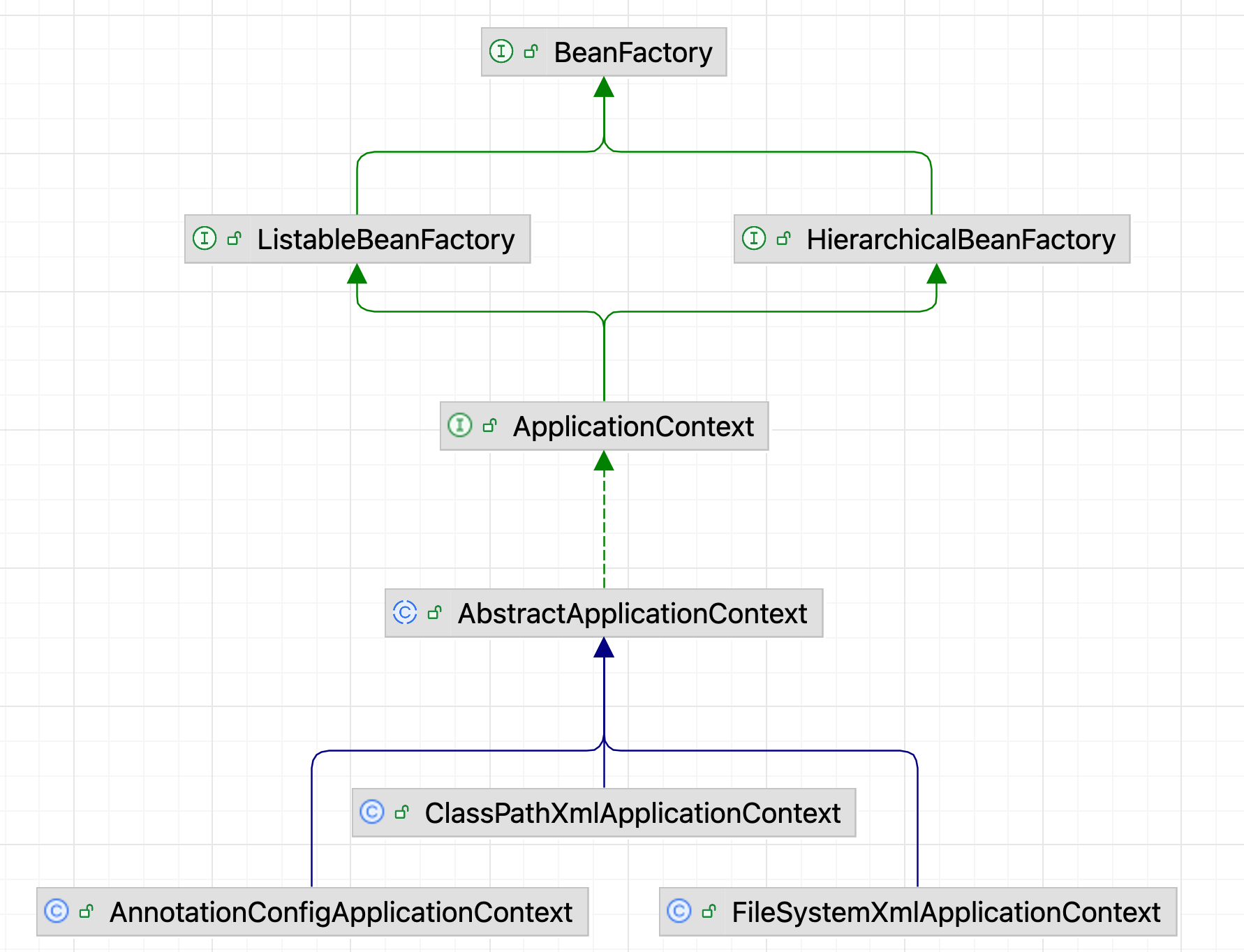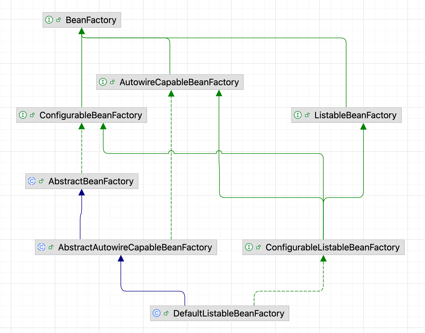 BeanFactory 有三个子类:ListableBeanFactory、HierarchicalBeanFactory 和 AutowireCapableBeanFactory,最终的默认实现类是 DefaultListableBeanFactory,实现现了所有接口: