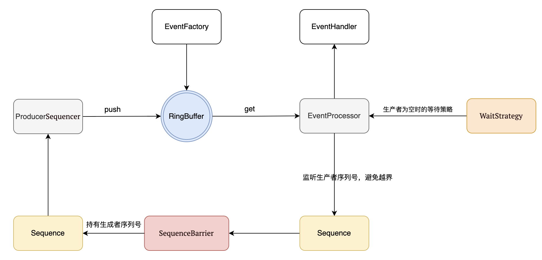 - 消费者(EventHandler)从RingBuffer中读取事件,但是读取之前会通过 SequenceBarrier 检查事件是否准备好,如果事件已准备好,消费者调用 get() 方法从 RingBuffer 中读取事件,并通过自己的 Sequence 更新处理进度