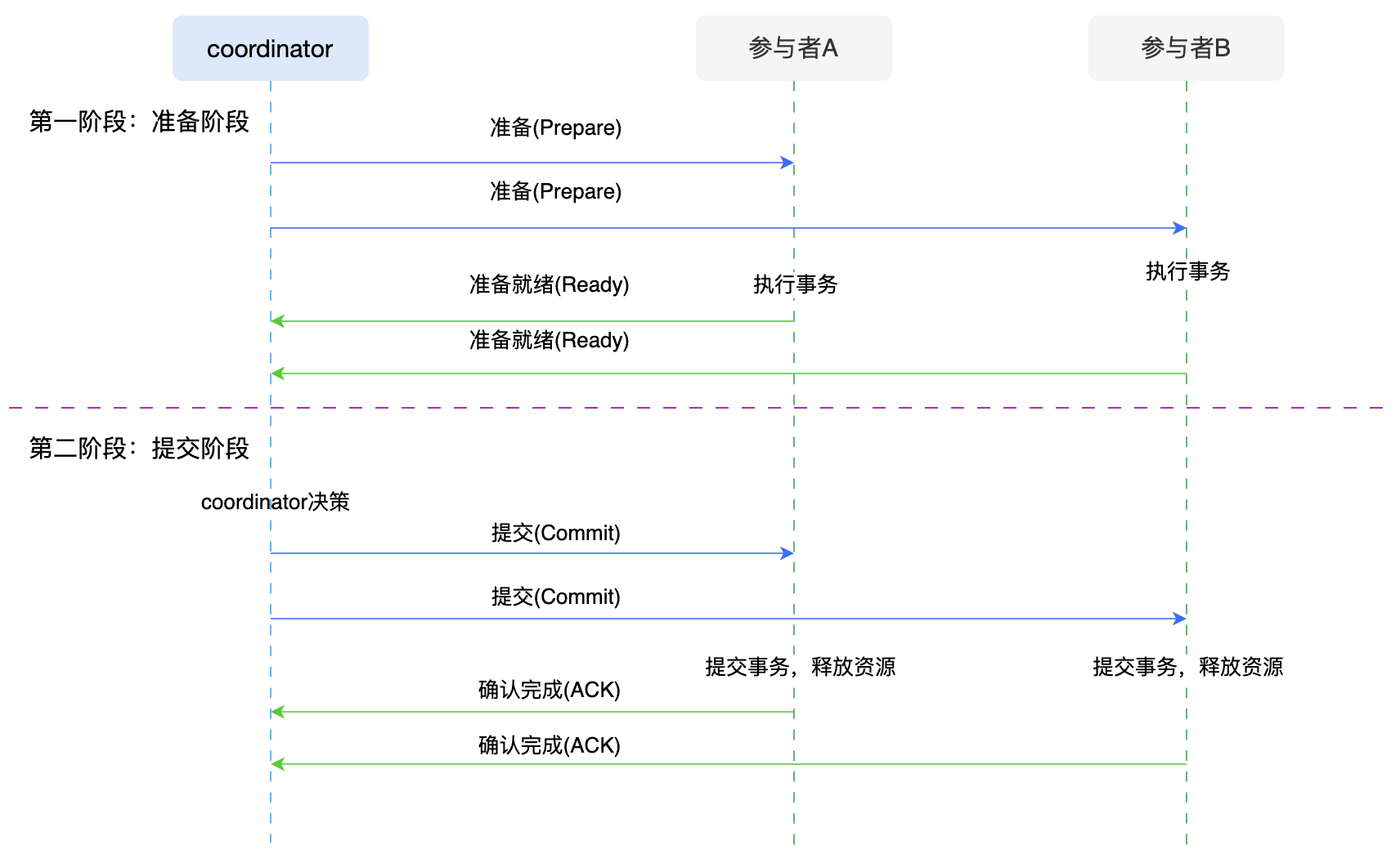 2PC引入一个作为协调者(coordinator)的组件来统一掌控所有参与者(participant)的操作结果,并最终指示这些节点是否要把操作结果进行真正的提交: