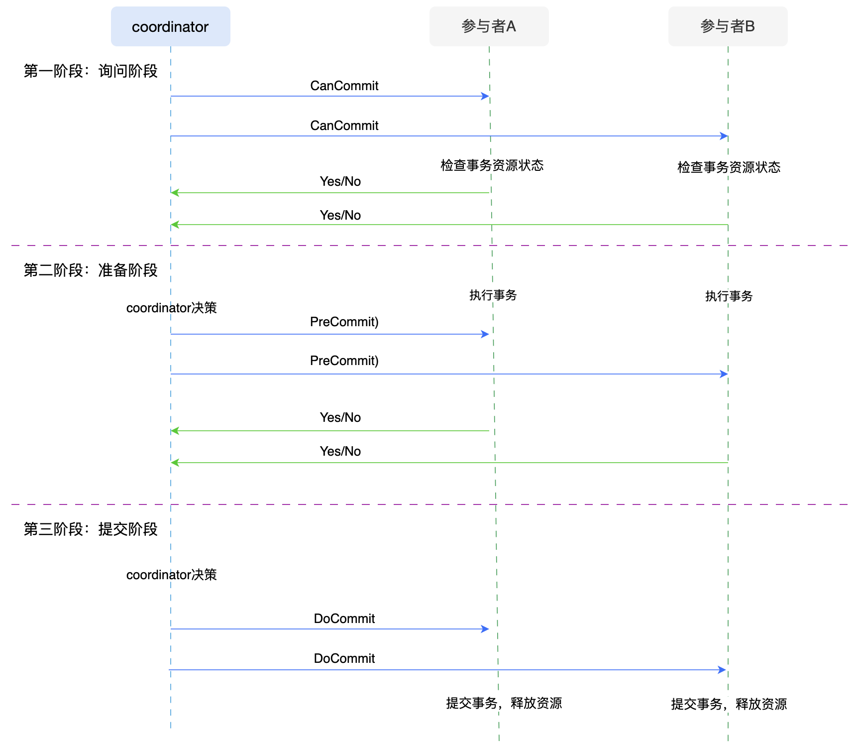 为了缓解两段式提交协议的一部分缺陷,具体地说是协调者的单点问题和准备阶段的性能问题,后续又发展出了三段式提交协议(3PC)。3PC是在2PC的基础上,在第一阶段和第二阶段中插入一个准备阶段,把原本的两段式提交的准备阶段再细分为两个阶段:询问阶段(CanCommit)、准备阶段(PreCommit)以及提交阶段(DoCommit)。一方面新增一个 询问阶段(CanCommit),提前确认下各个参与者的状态是否正常,另一方面引入超时机制,解决资源阻塞问题;