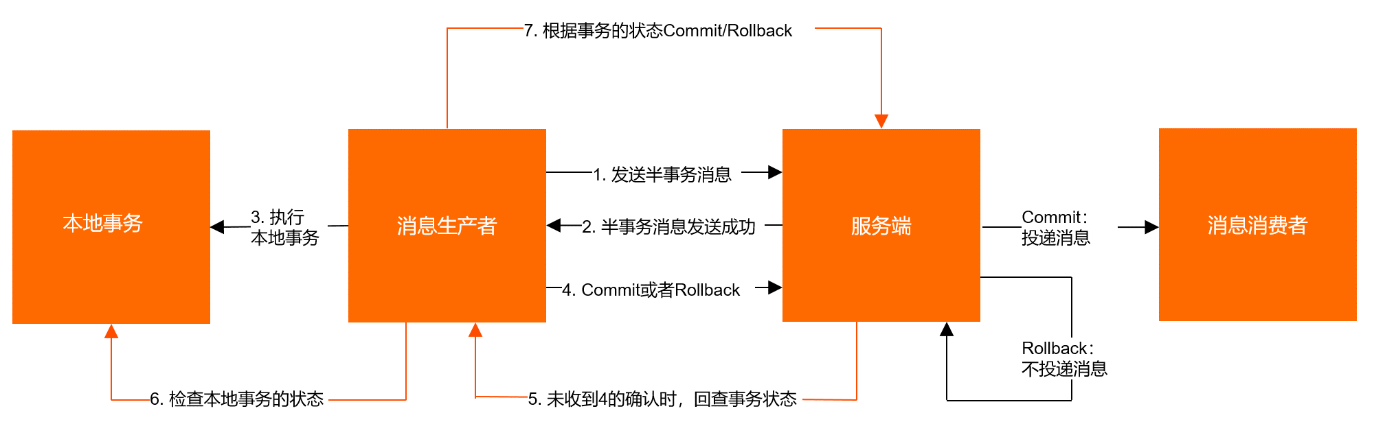 - 二次确认结果为Rollback:服务端将回滚事务,不会将半事务消息投递给消费者。