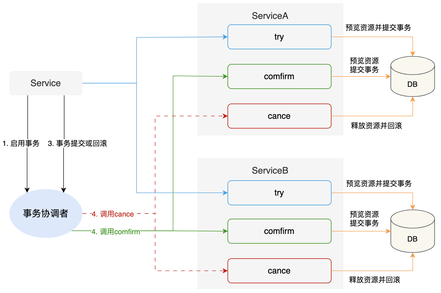 - Cancel: 如果任何一个服务的业务方法执行出错,那么这里就需要进行补偿,即执行回滚操作,释放Try阶段预留的业务资源 ,Cancel操作要求具备幂等设计,Cancel失败后需要进行重试。