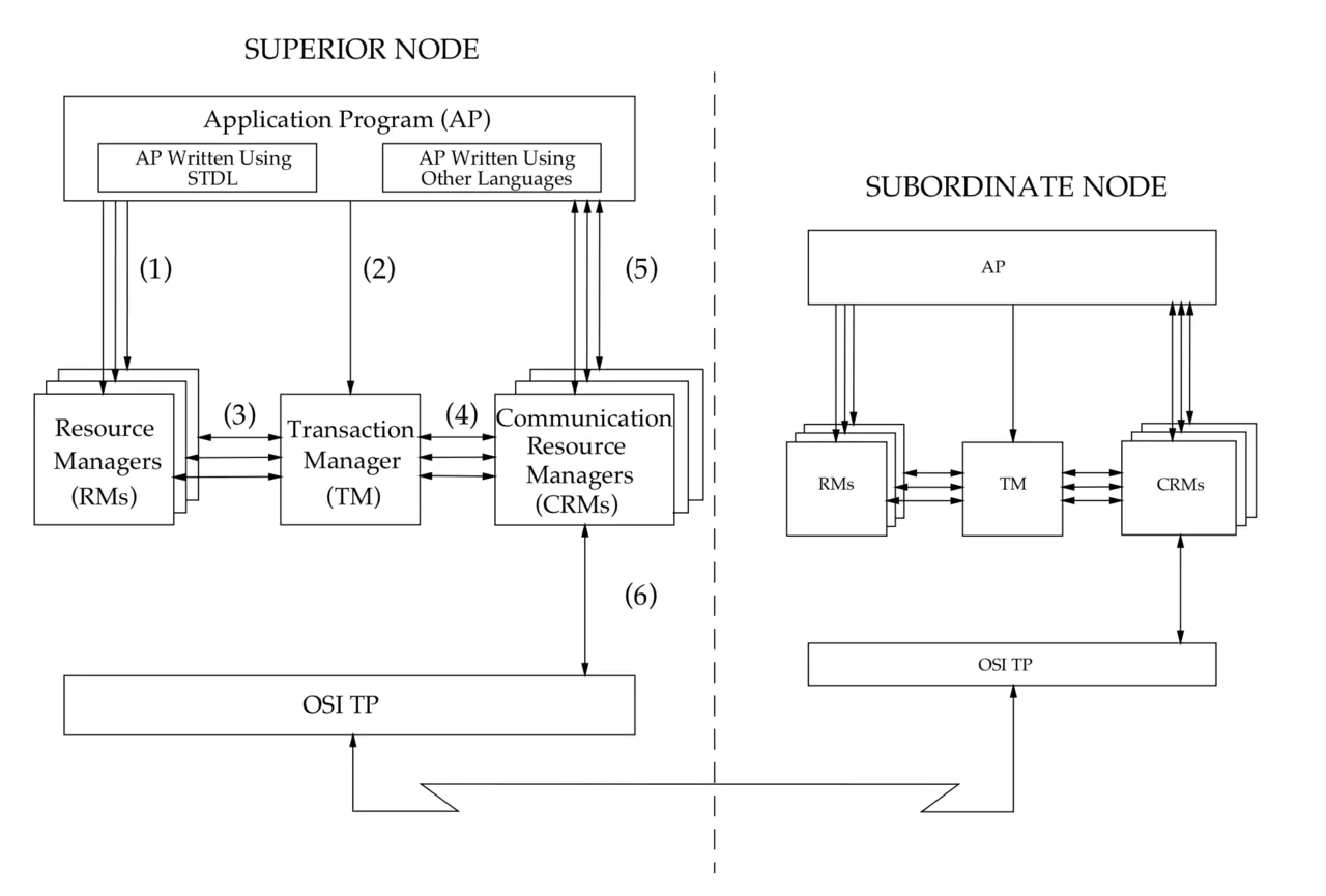- CommunicationResourceManager(CRM) 通信资源管理器控制一个或多个 TM domain 之间分布式应用的通信。