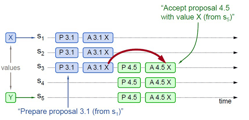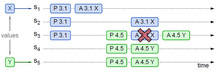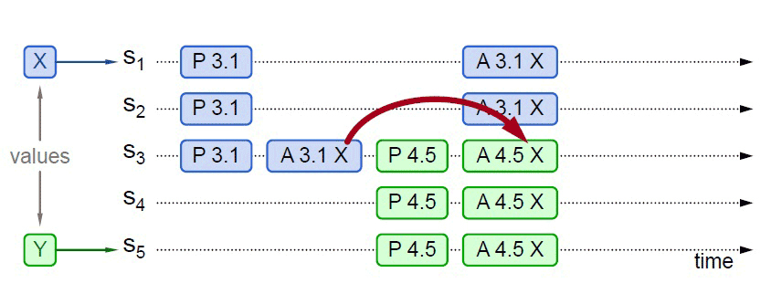 情况三:先前的值未被选中,新的提议者Accept节点未包含前一个提案值,最终会被授受的提案为后一个提案值。如下图,应答S5提案时,节点S1、S2已经批准了X,S3未批准但返回了Promise应答,此时S5以更大的提案ID获得了S3、S4和S5的Promise。这三个节点均未批准过任何值,那么S3将不会再接受来自S1的Accept请求,因为它的提案ID已经不是最大的了,这三个节点将批准Y的取值,整个系统最终会对“取值为Y”达成一致。