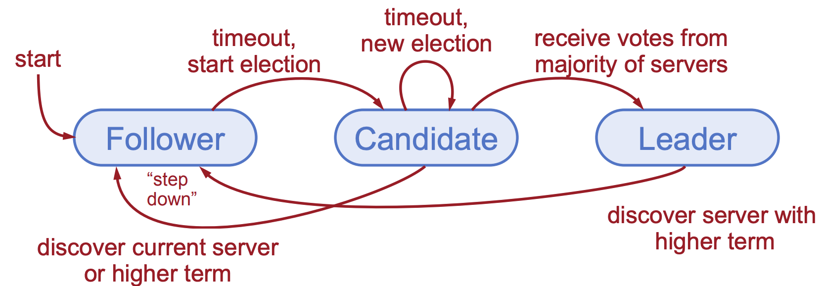 - 在等待投票期间,Candidate 收到了一个来自新 Leader(必须是不小于自己任期的 Leader)的 AppendEntries RPC(心跳)。响应并承认新 Leader 的合法性,立即转变为 Follower。