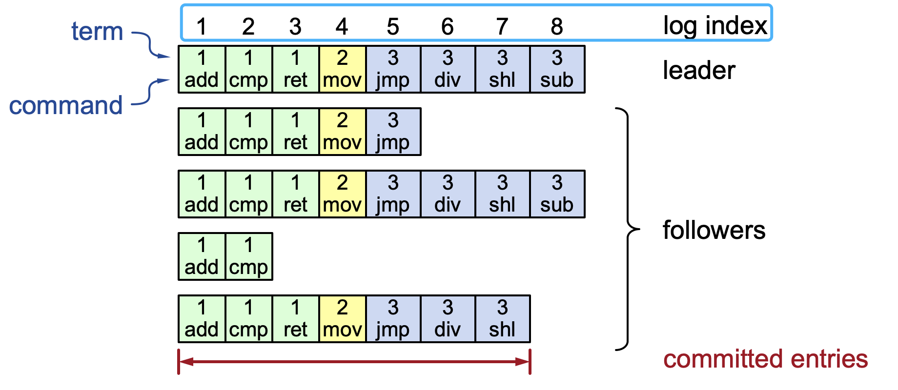 - command (命令):包含客户端请求的、需要被状态机执行的具体操作(例如 SET x = 5 或 DEL y)。