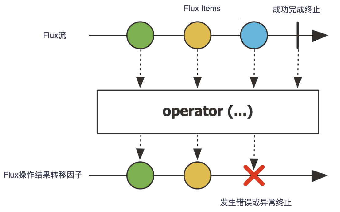 Flux 是一个发出(emit)0-N个元素组成的异步序列的Publisher<T>, 可以被onComplete信号或者onError信号所终止。一个 flux 的可能结果是一个 value、completion 或 error,就像在响应式流规范中规定的那样,这三种类型的信号被翻译为面向下游的 onNext,onComplete和onError方法。需要注意,所有的信号事件, 包括代表终止的信号事件都是可选的:如果没有 onNext 事件但是有一个 onComplete 事件, 那么发出的就是 空的 有限序列,但是去掉 onComplete 那么得到的就是一个 无限的 空序列。