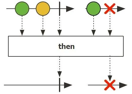 then()/thenEmpty():不关心发布者输出了哪些元素,而只关心它何时完成发布的情况。因此,它会接收一个现有的发布者,丢弃它所有的元素,然后传播完成信号或错误信号。如果我们把任何 Mono 作为 then() 的参数传递,它会将该 Mono 作为输出传递。